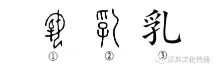 “室中更無人,惟有乳下孫。”這個“乳”字本為象形字。甲骨文①就像一個母親面朝左而跪坐著,兩手環抱一個娃娃,胸前的一點為乳房,表示給娃娃喂奶。②是小篆的形體,其右邊的曲筆是“女”形之訛變。③是楷書的寫法。