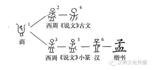”演進(jìn)為“皿”,該字遂分為二系:一系“皿”中有水,后又省“皿”,演進(jìn)為《說(shuō)文》古文;一系秉襲商代金文,后來(lái)演進(jìn)為《說(shuō)文》小篆與隸書。因?yàn)橛扇萜餍斡灦鴣?lái)的“皿”字與“孟”字讀音相同(均屬明紐陽(yáng)部),故而許慎曰:“從子,皿聲。”“孟”本義為首生,也就是排行中的“長(zhǎng)”,亦即老大。《說(shuō)文》:“孟,長(zhǎng)也。”引申為始。《楚辭離騷》:“攝提貞下孟陬兮。”王逸注:“孟,始也。”(李義海)