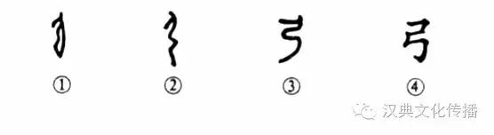 唐代大詩人杜甫說“挽弓當挽強”,只有強弓才彈性強、力量大、射得遠。從甲骨文①看,左邊是弓背,右邊是弓弦,真像古代的武士所用的強弓,所以“弓”字是個象形字。②是金文的形體,只有弓背而省掉了弓弦。小篆③大體與金文相似,還有弓的樣子。可是楷書④就看不出弓形了。