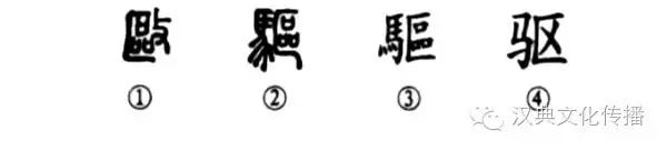 這是“為淵驅魚”的“驅”字,本為形聲字。①是石鼓文的形體,左“區”右“支”,表示“撲打”、“驅趕”。②是小篆的形體,將“支”改為“馬”,亦有道理,這同樣是表示“趕馬”的意思。③是楷書繁體字。④為簡化字。