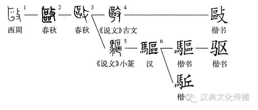 形聲字。從攴,區聲。或從馬,區聲。或從馬,丘聲。《第一批異體字整理表》規定“驅”為正體,“敺”“駈”則作為異體字加以淘汰。《簡化字總表》規定“馬”作偏旁簡化為“馬”,“區”簡化為“區",故“驅”類推簡化為“驅”。早期字形從攴,本義當為策馬前進,泛指驅趕人畜。《詩·唐風·山有樞》:“子有車馬,弗馳弗驅。”《左傳·桓公十一年》:“明日,絞人爭出,驅楚役徒于山中。”(孟蓬生)