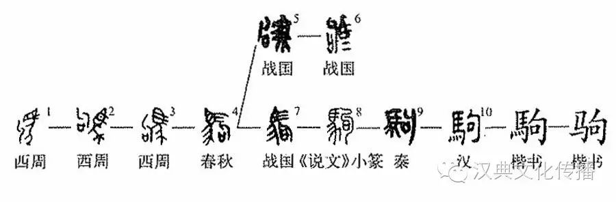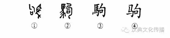 這是“白駒過隙”的“駒”字,本為形聲字。①是金文的形體。左邊是“句”,表聲;右邊是“馬”,表形。②是小篆的形體,“馬”移于左邊,其義不變。③是楷書繁體字。④為簡化字。