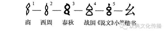 “幺”字讀作yāo,是個象形字。①是周朝早期金文的形體,像一小束絲的樣子。②是小篆的寫法,與金文的形體相似。③是楷書的形體。