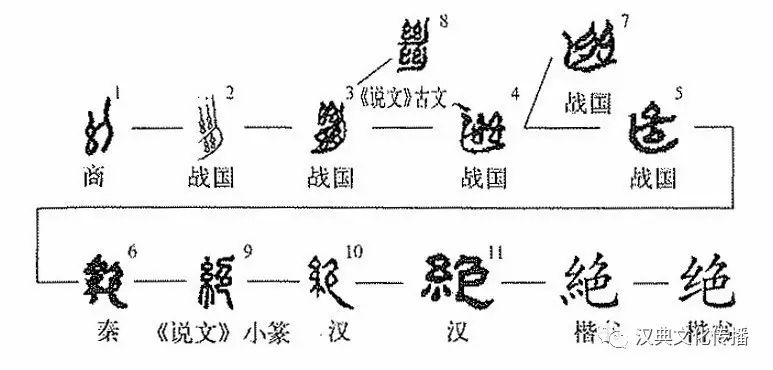 會意字。甲骨文“絕”字,從刀、從糸,會以刀斷絲之意。戰國文字承襲甲骨文,所從的“糸”或繁化為二糸、四糸。從刀、從四糸者,為《說文》古文所本。但《說文》古文所從的“ ”乃由“刀”訛變。秦文字“絕”字從糸、從刀、從卩,與《說文》篆文同。“絕”為“絶”之簡化字。本義是斷絕。《說文》:“絕,斷絲也。”《包山楚簡》249:“絕無后者。”(斷了后代的人)《呂氏春秋·本味》:“鐘子期死,伯牙破琴絕弦,終身不復鼓琴。”引申為拋棄,免除。郭店楚墓竹簡《老子甲》1:“絕巧棄利,盜賊無有。”(徐在國)