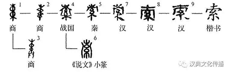 ,畫出了搓繩的雙手。后分化為“索”、“素”二字(索:心紐、鐸部,素:心紐、魚部;魚、鐸陰入對轉。“索”、“素”二字及偏旁均有相通的例子)。“索”,西周文字作