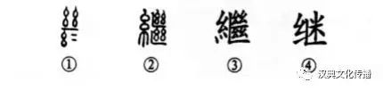 這是“夜以繼日”的“繼”字,本為象形字。①是金文的形體,像絲連續之形,故有“繼”義。②是小篆的形體,左邊又增加“絲”,右邊仍為絲的接續。③是楷書繁體字。④為簡化字。