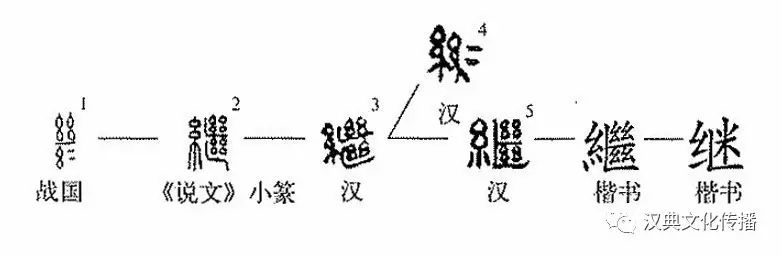 指事字。戰國文字“繼”字從二絲(右下“二”為省略符號),中間橫筆表示接續。漢帛書“繼”字仍從二絲,從二(省略符號)。《說文》“一曰:反
