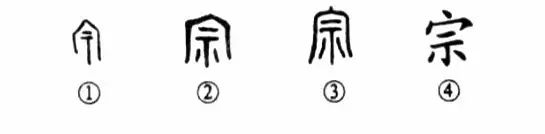 “萬變不離其宗。”這個“宗”字本為會意字。①是甲骨文的形體,外部是房舍,其內(nèi)有祭祖的靈石,表示這里就是宗廟。②是金文的形體,房舍之內(nèi)是“示(靈石)”,仍為祭祖之義。③是小篆的形體。④為楷書的寫法。