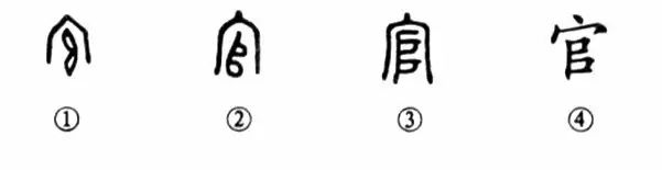 這個“官”字是個會意字。甲骨文①的外部是“山”,即上古的屋形,其內是“弓”。“弓”與“王(斧)”類似.在古代均為有鎮壓之權的標志??梢娢輧葤臁肮保潜硎緳嗤?,也就是“官府”的意思。②是金文形體,與甲骨文很相似。③是小篆的形體,屋內之“弓”,已經變得不像了。④是楷書的寫法。