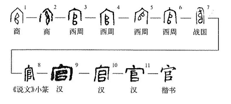 會意字。楊樹達《積微居小學金石論叢》:“《說文十四篇下??部》云:‘官,吏事君也,從宀,從??,??猶眾也。此與師同意?!l先輩何子貞先生《東州草堂文鈔》卷八跋《漢潘乾校官碑》云:‘校官者,學舍也。官字從宀,凡從宀之字皆以屋室為義……’”姚孝遂《甲骨文字詁林》“官”字條后按語:“《說文》訓官為‘吏事君也’,乃后起之義。王筠《句讀》已疑之。俞樾《兒笘錄》云:‘宀者交覆深屋也,吏事君者何取而從宀?許君說此字殆未得其本義矣。今按官者館之古文也。從宀覆??,正合館舍之義。食部:館,舍也,從食官聲。此乃后出字,古字止作官?!抖Y記·曲禮篇》:在官言官,注曰:官謂版圖文書之處也?!队裨迤罚涸诠俨毁箤眨⒃唬汗僦^朝廷治事處也。官皆即館字。《易·隨》:初九有渝,《釋文》曰:‘官,蜀才本作館。蓋官古字,館今字也?!瓌t‘帝官’、‘帝不官’,官亦當讀作‘館’。待賓客之舍曰館,賓客止于舍亦謂之館?!对姟す珓ⅰ贰卺偎桂^’,《左傳·僖十五年》:‘改館晉侯,饋七牢焉?!^均用為動詞。”總之,官本義為館舍之義。(周寶宏)