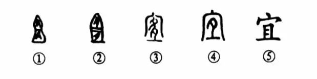 “欲把西湖比西子,淡妝濃抹總相宜。”這個“宜”字,本為象形字。①是甲骨文的形體,其外形就像古代祭祀時盛牛羊等祭品的禮器,中間的兩個“A”字形代表祭品(牛羊肉)。②是金文的形體,較甲骨文復雜了一些。③是《說文》中古文的寫法,其外部變為“宀”字,像一個罩子。④為小篆的形體,較前者簡單了一些。⑤為楷書的形體。