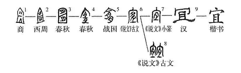 象形字。此字在商和西周時,都像兩塊肉在俎上之形。到了春秋時,像俎的邊沿的弧形與下邊的一橫分離開。《說文》古文以后,斷開的弧形演變成為“宀”。《說文》古文還保留兩塊肉的形狀,到篆文中只剩下一塊肉之形了。隸楷之后,字形演變為從宀、從且了。本義是菜肴。《爾雅·釋言》:“宜,肴也。”邢昺疏:“謂肴饌也。”引申指烹調菜肴。《詩·鄭風·女曰雞鳴》:“弋言加之,與子宜之。”又引申為祭名、適宜的事、相稱、應當等意義。(張玉金)