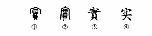 “傳聞之事,恒多失實。”這個“實”字本為會意字。①是金文的形體,其上部為“宀”,即房屋之形,屋內(nèi)有“貫(錢財)”。②是小篆的形體,與金文形體相似。③是楷書繁體字。④為簡化字。