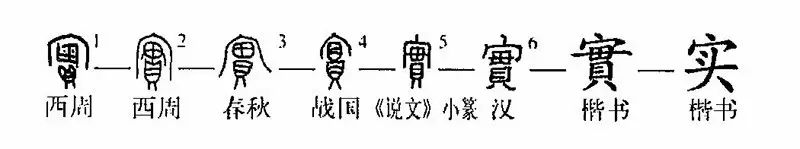會意字。西周金文有的從宀、從田、從貝,有房有田又有貝(古代貨幣)表示富有;西周金文有的從宀、從貫,“貫”本指穿錢用的繩索,這里指錢。小篆以后沿用了這種寫法。本義是富裕。《說文》:“實,富也。從宀,從貫。貫,貨貝也。”段玉裁注:“以貨物充于屋下,是為實。”《漢書·食貨志上》:“食品貨通,然后國實民富。”引申有財富、物資、滿、盛、充實、堅實、果實、事實,真誠等意義。可通假為“寔”,相當(dāng)于“是”;還可通假為“至”,讀為zhì。“實”的偏旁“貫”新中國成立后簡化漢字時被簡化為“頭”。(張玉金)