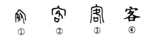 “渭城朝雨淚輕塵,客舍膏青柳色新。”這個“客”字本為會意字。①是甲骨文的形體,郭沫若認為是“客”之古字。上部的外面是房屋之形,屋內(nèi)右邊有一個面朝左的人,其左邊有一只大腳,表示外人到了的意思。②是金文的形體,房內(nèi)變?yōu)椤案鳎ǜ瘢弊郑瑸椤暗竭_”之義,仍表示外人到了的意思。③是小篆的形體,與金文相似。④為楷書的寫法。