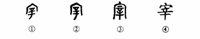 這個(gè)“宰”字。也是會意字。甲骨文①在“宀”(屋)內(nèi)有“辛”,“辛”字本為平頭刀之形.也就是說在屋內(nèi)以刀操勞即為“宰”,所以“宰”本為奴隸。②是金文的形體,沒有什么變化。③是小篆的形體,筆畫較甲、金文多了幾筆。楷書④是直接由小篆演變而來。