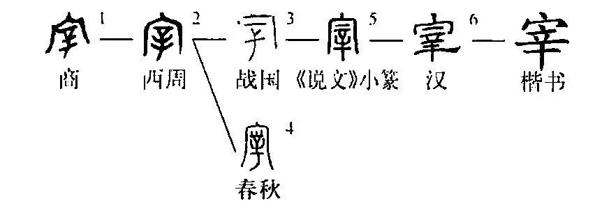 會意字。《說文》:“宰,辠(罪)人在屋下執(zhí)事者。從宀,從辛。辛,辠也。”此字所從的“宀”代表房屋,所從的“辛”代表與罪過刑罰有關(guān)的意義。本義是充當(dāng)家奴的罪人。引申有官名、主宰者、治理、殺牲、墳?zāi)沟纫饬x。可通假為“采”(cài),有“封邑”的意義;通假為“滓”(zǐ),有渣滓的意思。(張玉金)