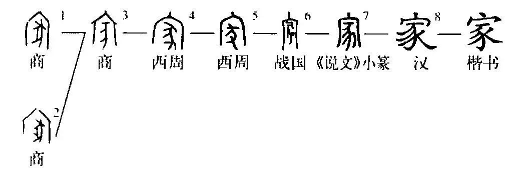 會(huì)意兼形聲字。《說(shuō)文》:“家,居也。從宀,豭省聲。”又說(shuō):“豭,牡豕也。”此說(shuō)有據(jù)。在商代甲骨文中,“家”有兩種寫法,一種是“宀”(房屋的象形)中的豕為雄性的(腹部有突出的雄性生殖器),另一種較簡(jiǎn)單的寫法,不強(qiáng)調(diào)性別。突出雄性生殖器的“豕”應(yīng)是“豭”的象形初文,是兼稱聲符的。而不強(qiáng)調(diào)性別的“豕”則是省形。到了周代金文中以不強(qiáng)調(diào)性別的寫法為主,后世的“家”字就是由這種寫法演變而成。在商代甲骨文中,“家”中的“豕”大多是畫(huà)出豬體的輪廓,也有只畫(huà)出豬體的線條的,周代金文的“家”是由這種簡(jiǎn)便的寫法演變而成。在甲骨文中出現(xiàn)了省略像豕的前蹄的筆畫(huà)的寫法,但周代金文則是由甲骨文的完整寫法演變而成。另外,在周代金文中“豕”的原像豬的后蹄和豬尾的筆畫(huà)是連成一筆的,一直到西漢隸書(shū)中才分成兩筆,到了東漢隸書(shū)中又分成三筆,書(shū)寫更便利了。(張玉金)