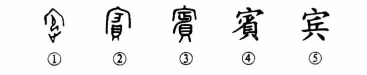 這是“賓至如歸”的“賓”字,本為會意字。甲骨文①的外部是房屋之形,中間跪著一個人,人下有“止(腳)”,表示走進祀神之意。②是金文的形體,其下部又增加了“貝”。③是小篆的形體,發生了較大的訛變。④為楷書繁體字的形體。⑤為簡化字。