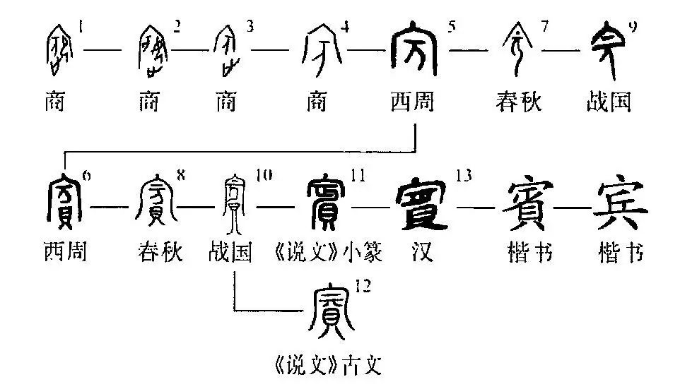 ”中增加一曲筆而形成的,隸定作??(與《說文·宀部》訓為“冥合”、音miàn之“??”同形,但非一字。《集韻·真韻》:“賔,古作賓、??。”)。秦代以后,隨著“賓”字的流行,“??(bīn)”字逐漸廢棄,人們對“賓”的結構也產生誤解,以為它是從??(miàn)聲的字了。本義是引導,迎接賓客。這個意思后來寫作“儐(儐)”。《合集》22692:“丁卯卜,即貞:王賓報丁祭,亡尤?”(丁卯這天占卜,卜人即貞問:王為報丁的祭祀舉行迎神儀式,不會有災禍吧?即:卜人名。報丁:商先公名)《書·舜典》:“賓于四門,四門穆穆。”孔傳:“諸侯來朝者,舜賓迎之。”《穆天子傳》卷六“內史賓侯,北向而立。”引申指賓客。《詩·小雅·鹿鳴》:“我有嘉賓,鼓瑟吹笙。”《左傳·襄公三十一年》:“賓至如歸。”虘鐘:“用濼(樂)好??(賓)。”(字形5)邾公?鐘:“用樂我嘉??(賓)。”(字形7)又引申指贈送。睘卣:“王姜令乍(作)冊睘安尸(夷)白(伯),尸(夷)白(伯)賓貝布。”(王姜命作冊問候夷伯,夷伯送給睘貝和布)《國語·楚語下》:“公貨足以賓獻。”韋昭注:“賓,饗贈也。”也指贈送的物品。仲幾父簋:“中(仲)幾父、史幾史(使)于者(諸)侯者(諸)監,用氒(厥)賓乍(作)丁寶簋。”(仲幾父、史幾出使于諸侯諸監,用諸侯諸監贈送的禮物做了祭祀丁的寶簋)在清刊本《嶺南逸事》中,“賓”字作“賓”(見《宋元以來俗字譜》48頁。這是把“賓”中“宀”下的部分改作“兵”,成為從宀、兵聲的新形聲字)。新中國成立后,“賓”簡化為“賓”。(冀小軍)