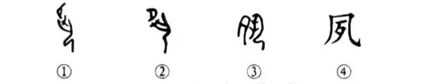 這是“夙(sù速)夜匪懈”(晝夜不息)的“夙”字。你看甲骨文①的左上方是個“月”形,“月”下跪著一個人,揚起雙手表示勞作。多勤勞啊!天不亮就起來干活。金文②的左邊仍為“月”形,右邊是一個人。小篆③左邊為月形,但其右邊的“人”形已經偽變得很不像了。楷書④則把“月”(夕)變到“凡”中了,根本看不出“月”下有“人”形,變成了純文字符號。