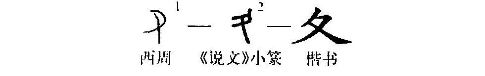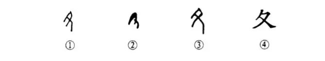 這個(gè)“夂(zhǐ 紙)”字是個(gè)象形字。甲骨文①很像腳根朝上、腳趾朝下的一只左腳。金文②那就更像一只左腳了。③是小篆的形體,與甲骨文①的形體相類似。楷書④就根本沒有腳的樣子了。