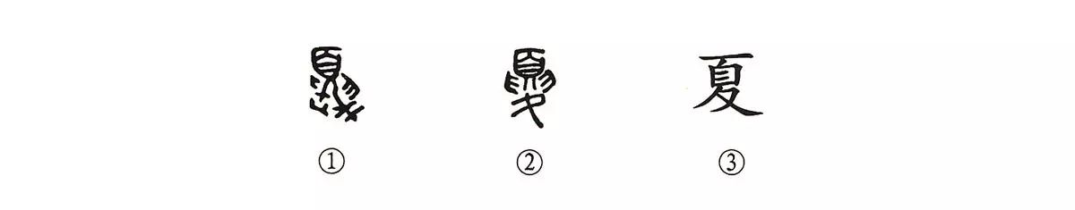 這個“夏”字的上古形體較為復雜。從金文①看,其上為“頭”,中間為“軀干”,兩側為“手”,其下為“足”,實際上就是“人”形。②為小篆的形體,也是“人”形,但已經發生了偽變,人的身軀部分沒有了,只是一只大腳還在。③是楷書的形體,它是從小篆演變而來,根本看不出人的形象了。