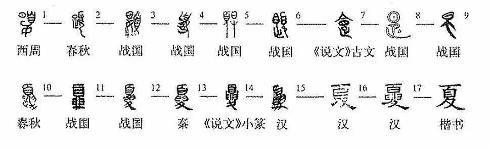 的寫法,可能是楚地的一種特殊寫法,也可能是表示夏季天氣炎熱有蟲類活動的會意字。周秦文字傳統寫法一脈相承,成為漢代隸定的根據。夏義指夏朝或夏族,亦指華夏。如秦公鐘:“
