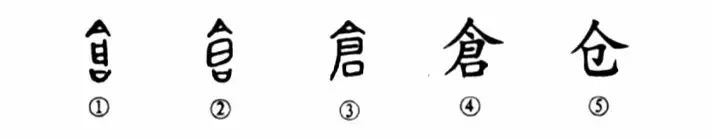 這是“稻菽滿倉”的“倉”字。從甲骨文①看,也很有點糧倉的意味,其上是倉的屋頂,中心是糧倉的一扇門,下部是倉的基石,這種一扇門的倉在山東膠東一帶是常見到的。金文②也與甲骨文相類似,只是中間的那扇門變形了。小篆③也與甲骨文的形體相接近,只是中間的那扇門與甲骨文的門相反,門樞由右邊移到了左邊。楷書④則看不出“糧倉”的樣子了,門與基石變成了“君”字。后因這個字太繁.所以簡化為“倉”。⑤的形體是“倉”字的草書楷化。