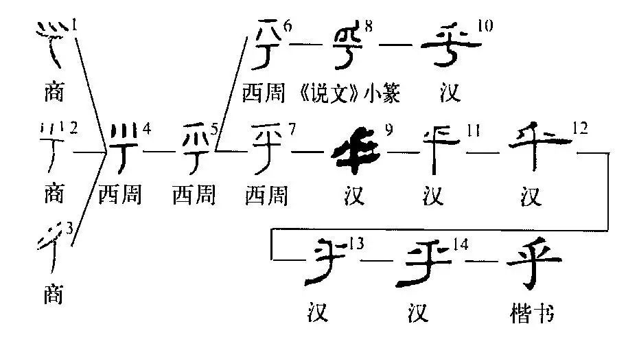 ”只是像聲氣分散上揚之形,并不是獨立的字形。“乎”與“兮”形音義都有關聯,二者是一字之分化,所以《說文》曰:“(乎)從兮,象聲上越揚之形也。”殷商時代的“乎”字上部是三個短畫,以豎畫為主,也有斜畫。至西周中期,短豎平行之態幾乎消盡,而變作不平行的“