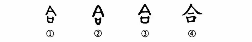 這是“敬獻(xiàn)合歡璧”的“合”手,是個(gè)象形字。甲骨文①像盛飯的食器,上部是蓋子,下部是食器底。一蓋一底即為一合。金文②和小篆③都與甲骨文的形體相類(lèi)似。楷書(shū)④也是與前面的形體一脈相承,沒(méi)有多大變化。從字形的分析可以看出,“合”字的本義是“關(guān)閉”的意思。