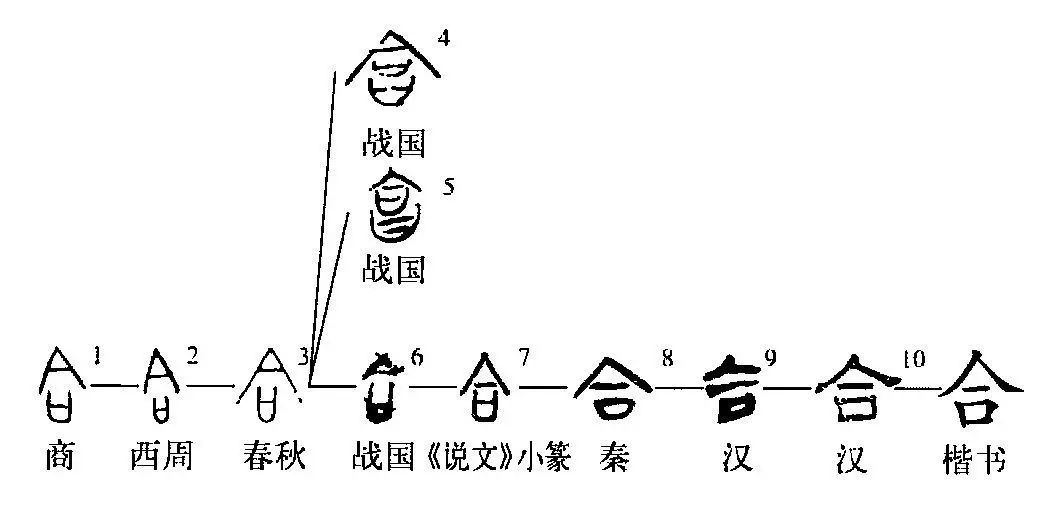 象形字。像蓋兒與器上下相合之形。“合”字從商代至現(xiàn)代,基本形式古今一貫,只有筆勢(shì)方面的微小變化。但在戰(zhàn)國(guó)期間,主要在楚系文字中有增從“甘”或“口”的寫(xiě)法,這種形式也見(jiàn)于以“合”為構(gòu)件的合體字。本義是蓋合,引申為閉合、聚合、結(jié)合、符合等義。《小屯南地甲骨》2350:“王其以眾合又(右)旅。”此用聚合義。《戰(zhàn)國(guó)策·燕策》:“蚌方出曝,而鷸啄其肉,蚌合而拊其喙。”此用閉合義。由聚合義引申為聯(lián)合、聯(lián)絡(luò)、合并、軍事交鋒等,還引申為副詞,有共同、一起義。由結(jié)合義特指男女結(jié)合,因此引申為匹配。由符合義引申為重合、適合,用于語(yǔ)言交際,所言符合對(duì)方的發(fā)問(wèn),是對(duì)答、回答,后來(lái)分化出“答”這個(gè)詞。以上意義,都讀hé。“合”另有讀ɡě一音,專(zhuān)用于容量單位,合、升、斗、石(dàn)是一組十進(jìn)制容量用詞。《漢書(shū)·律歷志》:“十合為升。”(金國(guó)泰)
