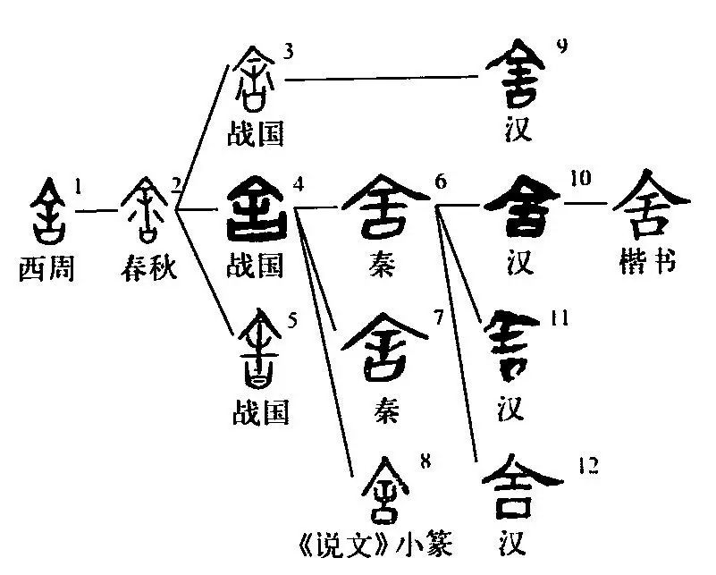 ”,但都沒能進人楷書規范。本義是口頭發布。《說文》:“市居曰舍。從亼,屮象屋也,囗(wéi)象筑也。”這是據小篆字形而曲解。古文字從口舌之“口”,不從“回幣”形之“囗”。西周善夫克鼎:“王令善夫克舍令于成周遹正八師之年”,“舍命”即發布命令。引申為發出、釋放、施予、給予。《詩·小雅·車攻》:“舍矢如破(放出箭就射中獵物)?!边M一步引申為離開、罷止、放棄。以上各義都讀shě。另有以下讀shè的一些意義:由罷止義引申為止息、止宿,由此進一步向多方向引申,軍隊住宿一夜為“舍”,軍行30里而短時休息為“舍”,處所、住所稱“舍”,星次,即星宿運行所至之處稱“舍”。由止息、止宿義還引申為安置、保留。由住所義引申為客館,引申為對自家或親屬的謙詞,如“舍間”“舍弟”。(金國泰)