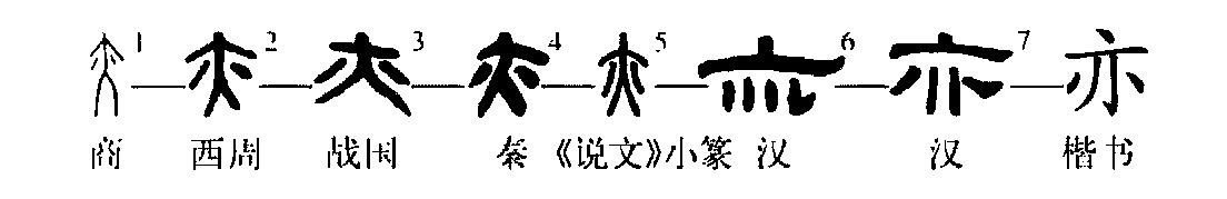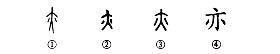 這個“亦”字是個典型的指事字。甲骨文①是正面立著的一個人,兩臂之下的兩個點兒就是指事符號,表示這里就是腋下。金文②也是這種形體。小篆③與甲金文字一脈相承。④是楷書的形體,中間的“人”形變得根本不像了。“亦”字的本義是“腋”(上古沒有“腋”字)。但因為后世“亦”字被假借為虛詞用了,其義大致相當于現代漢語中的“也”字,“亦”字當“腋”講的本義就只好重新造一個新的左形(月即肉)右聲(夜)的形聲字“腋”來代表。從此,“亦”與“腋”有了明確的分工,“亦”字只作虛詞用,而“腋”字就代替了“亦”字的本義。