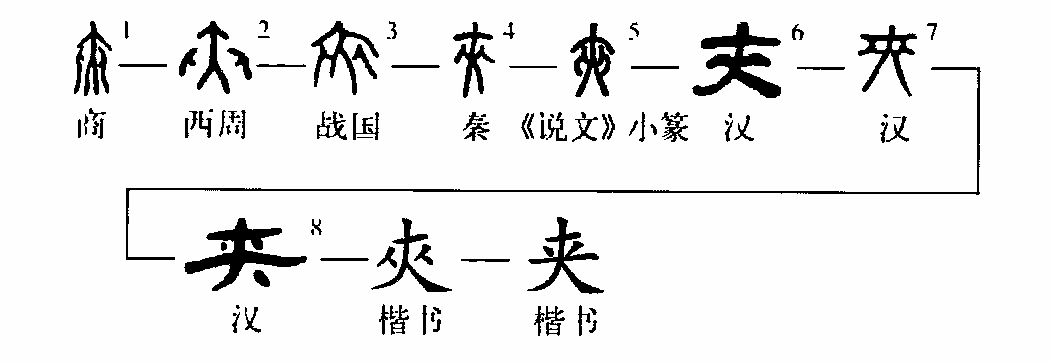會意字。從大,從二人,從左右二人攙扶中間一人會意。古今字形均作“大”下兩“人”?,F(xiàn)代漢字簡化時,據(jù)漢代草書將“夾”簡作“夾”。本義為挾持、從左右相持,讀作jiā。《說文》:“夾,持也。”《儀禮·既夕禮》:“薦馬纓三就,入門,北面,交轡(pèi,韁繩),圉人(養(yǎng)馬之人)夾牽之。”《墨子·雜守》:“守大門者二人,夾門而立。”由挾持引申為扶持、輔佐。也指從兩個相對的方向向內用力,使物體固定不動,引申指夾東西的器具。由從左右扶持義引申為在兩邊的、左右相對的、摻雜等義?!皧A”由二人挾持一人引申指里外兩層,如“夾衣”、“夾褲”,這一意義后又作從“衣”、“夾”聲的“裌”及從“衣”、“合”聲的“袷”,讀作jiá,現(xiàn)代漢字整理時,已將“裌”“袷”二字作為“夾”的異體字淘汰。又讀作xié,用作“挾”的通假字;又讀作xiá,用作“狹”的通假字;還讀作gā,用于“夾肢窩”一詞。(郭小武 葉青)
