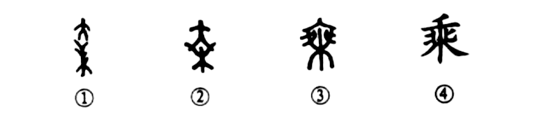 這是“乘肥馬,衣輕裘”的“乘”字,是個會意字。甲骨文①的下部是一棵樹,樹頂上站著一個人,表示乘于其上。金文②也是這個意思,其下是“木”(樹)形,其上是“人”形。小篆③下部的“木”形猶在,但其上的“人”形則不太像了,不過人的左右兩只腳倒是很像攀援樹枝之形。④是楷書的形體,中間的“北”字之形是由小篆中人腳之形變來的。