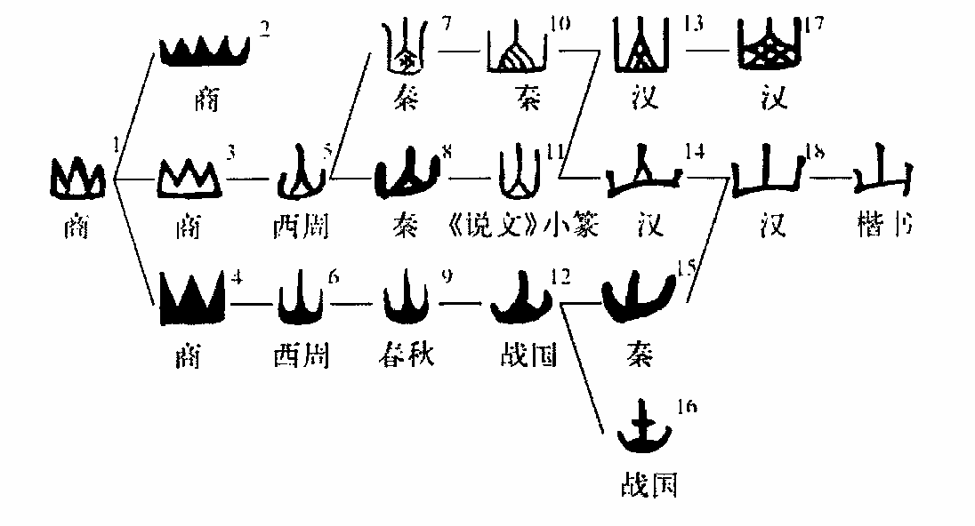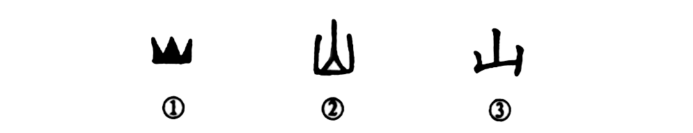 “黃河遠上白云間,一片孤城萬仞山。”這里的“山”字就是個象形字。金文①是三個山峰組成一個“山”字。小篆②為了書寫方便則將實心山變為單線的了,但三個山峰還仍然保存。③是楷書形體,基本上與小篆相同。