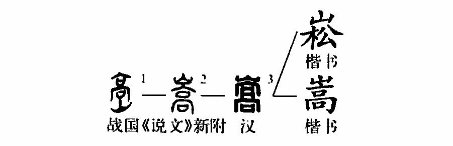這個(gè)“嵩(sōng松)”字是個(gè)會意字。金文①的上部是“山”,下部是“高”,“高山謂之嵩”。②是小篆的形體,與金文基本相同。③是楷書的寫法,是由小篆直接演變而來的。