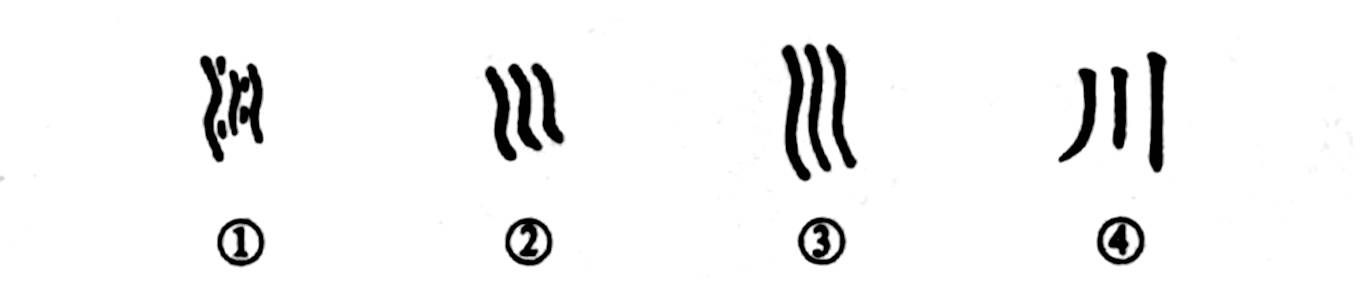 這是“百川灌河”的“川”字。甲骨文①彎彎曲曲的形狀像一條河流,曲線中的四個點兒是指河流中的漩渦。所以“川”字是個象形字,它的本義就當河流講。金文②則把水中的“點兒”去掉了,這是為了書寫方便。③是小篆形體,同于金文。④是楷書的形體。