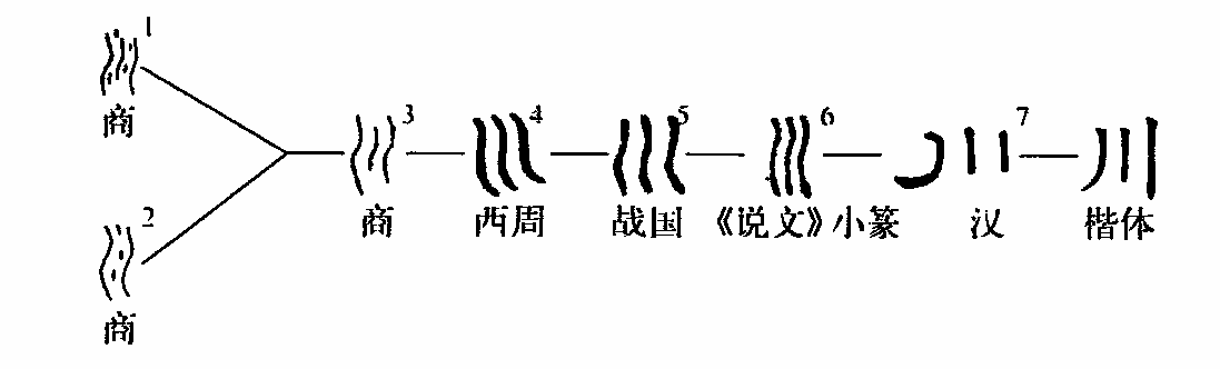 象形字。像兩岸中間有流水。“川”字甲骨文兩邊為岸,中間為流水;金文把中間水形變為