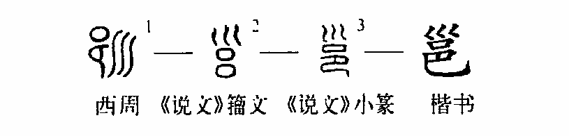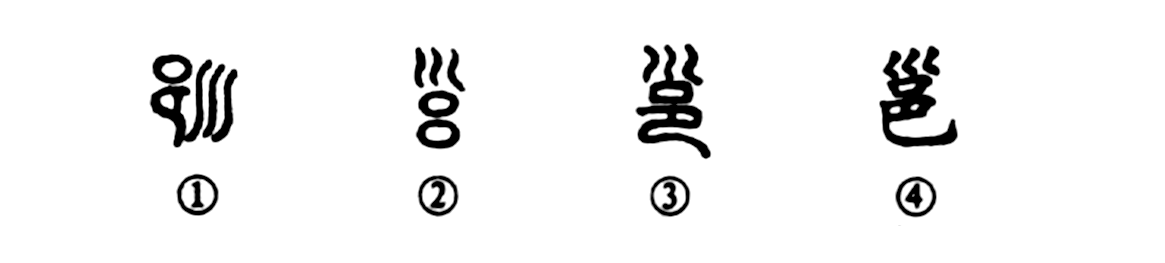 這是“君臣邕穆”的“邕”字,讀作yōng。本為象形字。①是金文的形體,右邊是“川”,左邊是“邑”。②是《說文》中籀文的形體,上部為“川”,下部的兩個圓圈像積水的沼澤。水入沼澤不能流通,這就表示“壅塞”的意思。③是小篆的形體,下部的沼澤之形訛變為“邑”,但意義未變。④是楷書的形體。