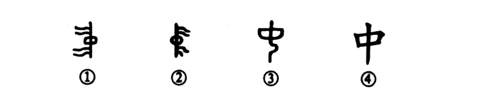 這是“卉中自生香”的“中”字,是個象形字。甲骨文①是直立的一面旗幟,向左彎曲的四條線是“旗游”(旗幟上的飄帶),而中間的“口”形就表示“中間”之意。②是金文的形體,“旗游”飄向右邊。③是小篆的形體,把“旗游”全省略了,中間旗桿呈彎曲形,這是一種書寫上的美化。④是楷書的寫法。