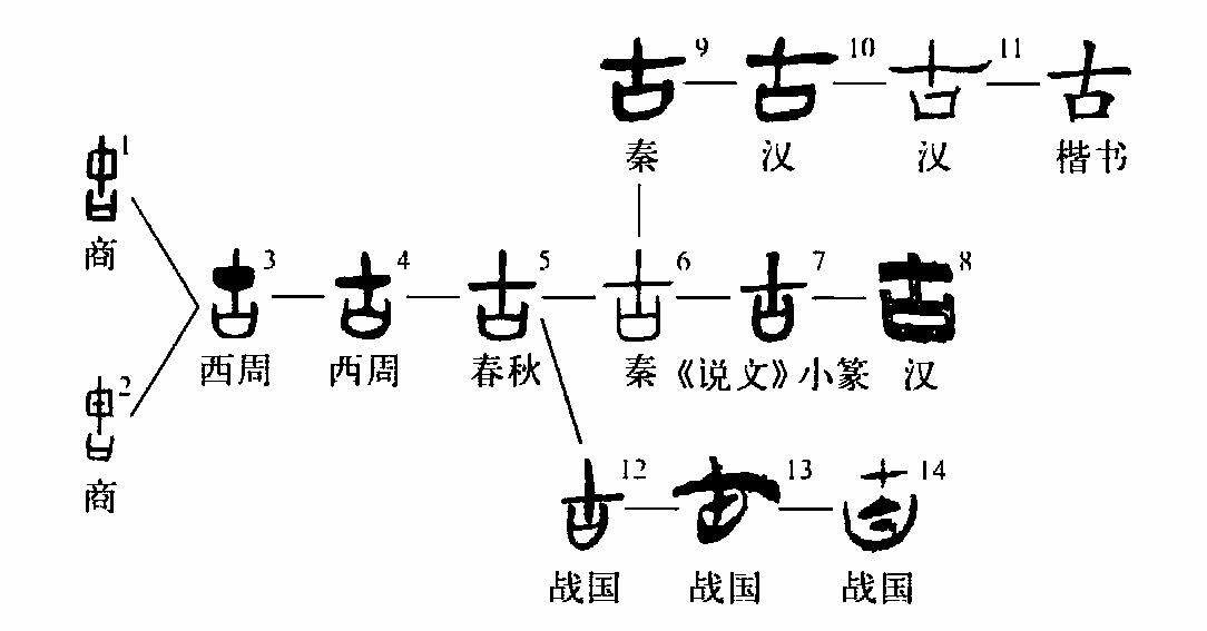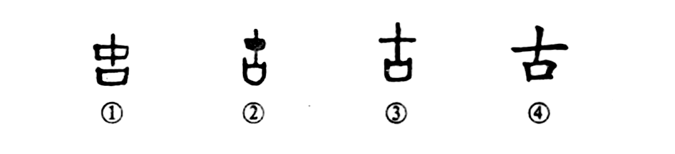 這個(gè)“古”字是個(gè)會意字。甲骨文①的上部可不是“中華”的“中”字,而是“十”字,表示“多”義;其下部是個(gè)“口”字。這是說,世世代代口口相傳就叫“古”。金文②的上部仍然是“十”字,下部是“口”字。小篆③和楷書④也基本上同于甲金文字。