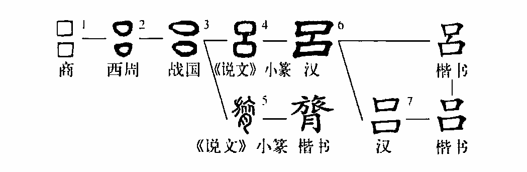 這個“呂”字也是個象形字。你看甲骨文①是兩個方“口”,表示人(或動物)的脊骨,一塊接一塊地連成一串。金文②則變成了圓形,當然也還像脊骨的樣子。小篆③為了使脊骨之間緊密相連,所以中間又加了一條連接線。④為楷書的寫法,是直接由小篆演變而來。后來為了書寫方便,則把楷書中間的那一豎筆省掉了,這就成為現(xiàn)行的楷書⑤的形體了。