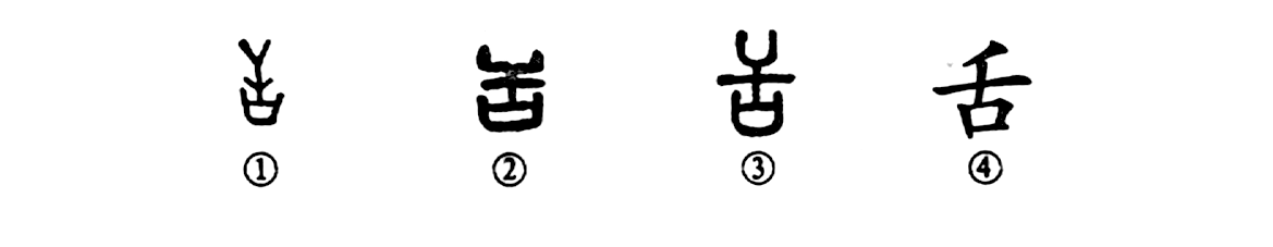這是“舌劍唇槍”的“舌”字,是個象形字。①是甲骨文的形體,整體像舌形。②是古陶文的形體,與甲骨文相似。③是小篆的寫法。④為楷書的寫法。