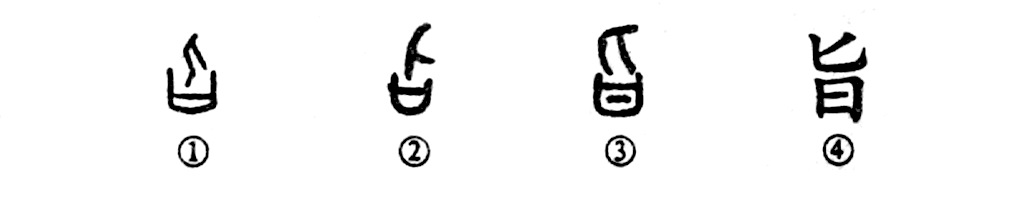 “彼有旨酒,又有嘉肴。”這個(gè)“旨”字是個(gè)會(huì)意兼形聲的字。甲骨文①的上部是“匕”,也就是“匙(湯匙)”的形狀,下部是“口”,盛湯入口便覺味美,這是會(huì)意。同時(shí),“旨”也是“從口,從匕得聲”的字,故為形聲。②是金文的形體,與甲骨文基本相同。③是小篆的寫法,將原形的“口”變?yōu)椤案省保案省睘椤疤稹绷x,所以“味美”的意思更為明顯。④為楷書的寫法。