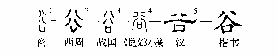 會意字。甲骨文字形下面像谷口,上面像水流出。甲骨文上邊是兩個八字,下邊是口形。金文與甲骨文略同。小篆字形規(guī)整勻稱,下面八字變形。隸書、楷書筆畫化,近于金文。本義是兩山之間的水流。《淮南子·說山》:“江河所以長百谷者,能下之也。”從本義引申指兩山中間的低洼地,如山鳴谷應。從兩山間的低洼地引申比喻困難。《詩·大雅·桑柔》:“進退維谷。”谷假借為“穀”。“穀”本是莊稼和糧食的總稱。漢陸賈《新語·慎微》:“棄二親,捐骨肉,絕五谷,廢《詩》、《書》,背天地之寶,求不死之道。”(馮華)