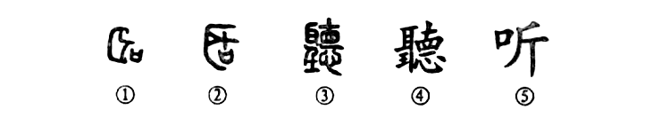 這是“逆風聽蟬唱”的“聽”字。甲骨文①的左邊是一個大耳朵,右邊是—個“口”,表示一人用口說,一人用耳聽,可見這是個會意字。②是金文的形體,與甲骨文基本相似。③是小篆的寫法,繁雜化了。左上方為“耳”,左下方是“壬”(站在土堆上的一個人),表音。右邊是“德”字的古體字。好像是“有德者耳聰”的意思。④是楷書的形體,直接由小篆演變而來。⑤為簡化字。