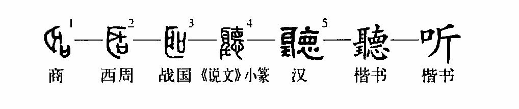 甲骨文、金文的聽是會意字,從耳從口,表示口有所言,以耳得之為聲,其得聲之動作為聽,《合集》8669:“方無聽。” (即沒有聽到方國的情況)《說文》小篆所從之悳為疊加聲符。《說文》:“聽,聆也。”段玉裁注:“聽者,耳有所得也。”《論語·公冶長》:“聽其言而觀其行。”聽而后從,引申為聽從、接受。《詩·大雅·蕩》:“曾是莫聽,大命以傾。”由聆聽又引申為考察、治理,即聽取情況而進行裁斷,治理。《周禮·秋官·小司寇》:“以五聲聽獄訟,求民情:一曰辭聽,二曰色聽,三曰氣聽,四曰耳聽,五曰目聽。”《荀子·王霸》:“相者,論列百官之長,要百事之聽。”楊倞注:“聽,治也。要取百事之治考其得失也。”又引申為等候。《周禮·地官·大司徒》:“正歲,令于教官曰:各共爾職,修乃事,以聽王命。”賈公彥疏:“聽,待也。”聽、聲、聖三字同源(參見“聖”字條)。聽現簡化為從口、斤聲之“聽”。從口、斤聲之“聽”見于《說文》,本義為笑的樣子。《說文·口部》:“聽,笑皃。從口、斤聲。”現代漢語中,“聽”之本義已廢,專表聽義。(秦曉華)