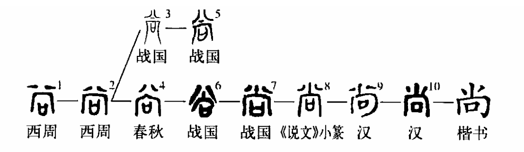 形聲字。《說文》:“尚,曾也,庶幾也。從八,向聲。” “曾”、“庶幾”均后來義,初義不知。字形不見于殷商甲骨文,而見于先周周原甲骨。金文中多假“尚”為“常”。陳侯因